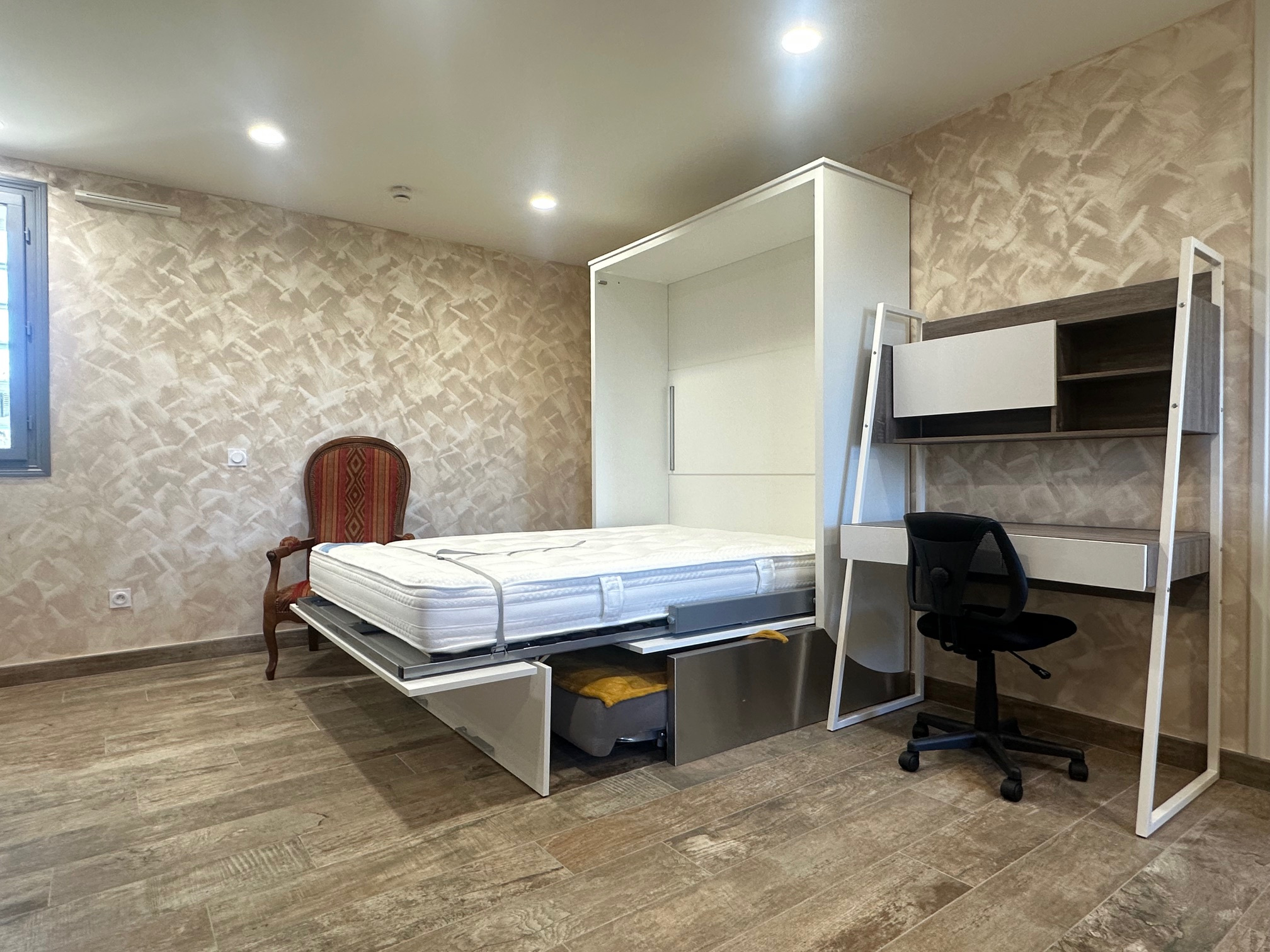 Il se compose d'une cuisine aménagée et équipée, un coin séjour avec canapé convertible, et une salle d'eau avec wc.