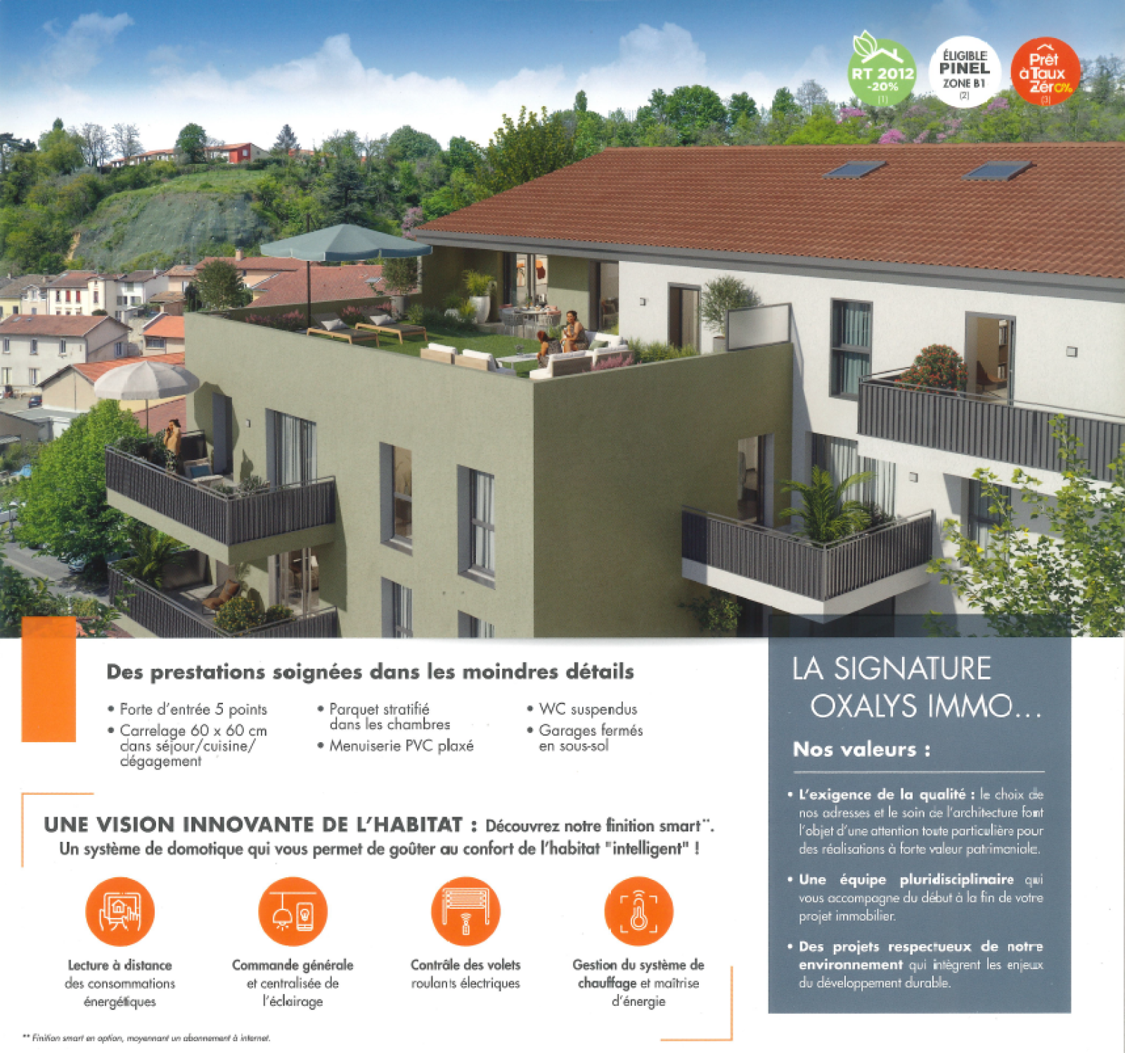 Les prestations soignées incluent une porte d’entrée sécurisée 5 points, un carrelage 60x60 cm dans le séjour et la cuisine, un parquet stratifié dans les chambres, des menuiseries PVC plaxées pour une isolation optimale, des WC suspendus et des garages fermés en sous-sol.