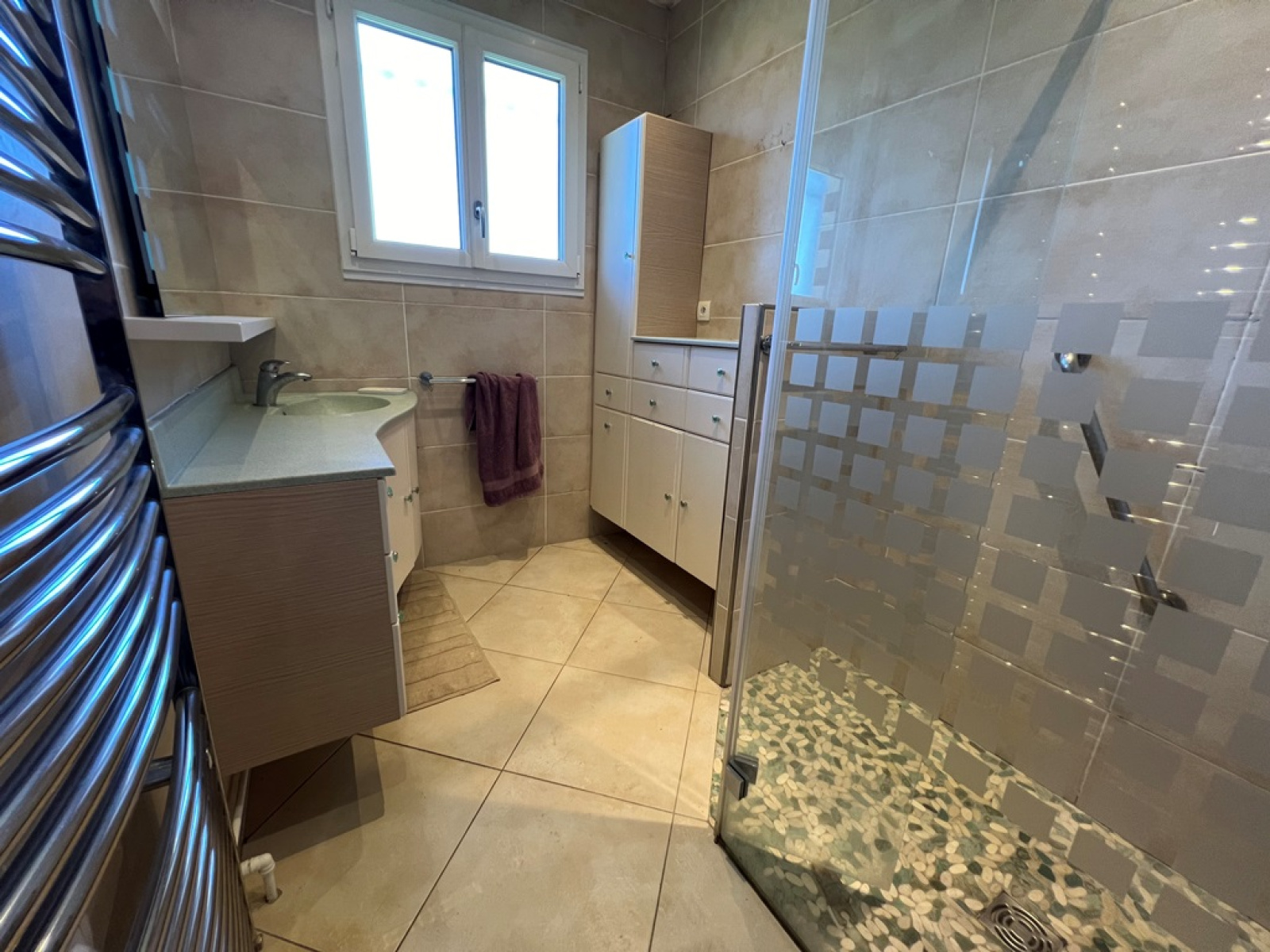 Demi-niveau haut : Trois chambres dont deux équipées de placards, une salle d'eau et un WC séparé, offrant un espace de vie confortable et fonctionnel pour toute la famille.