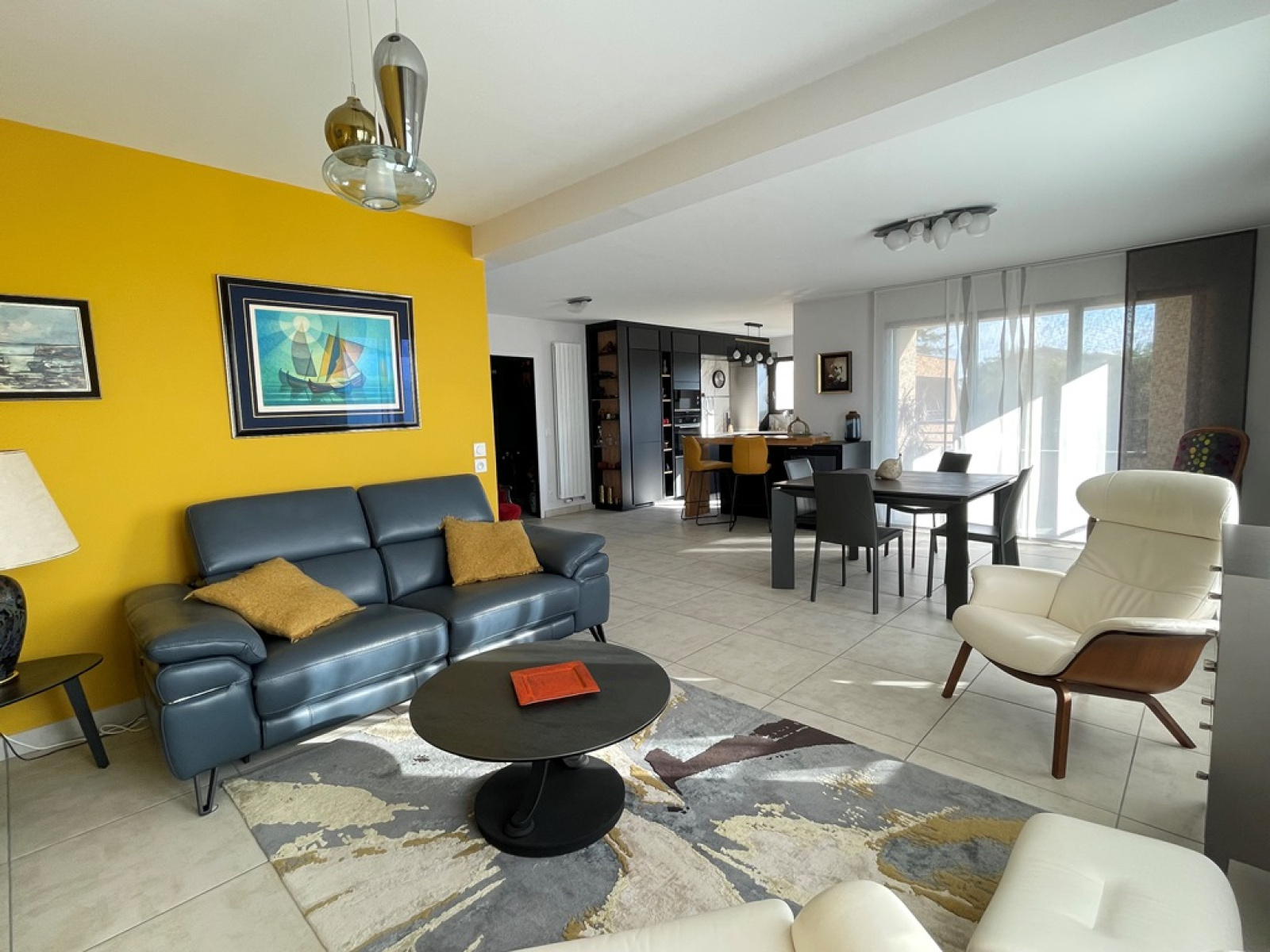 La pièce de vie spacieuse et baignée de lumière naturelle accueille un grand séjour double avec une cuisine aménagée et équipée ouverte, ouvrant directement sur une agréable terrasse couverte. Le tout offre une vue dégagée à l'ouest sur les monts du Lyonnais.